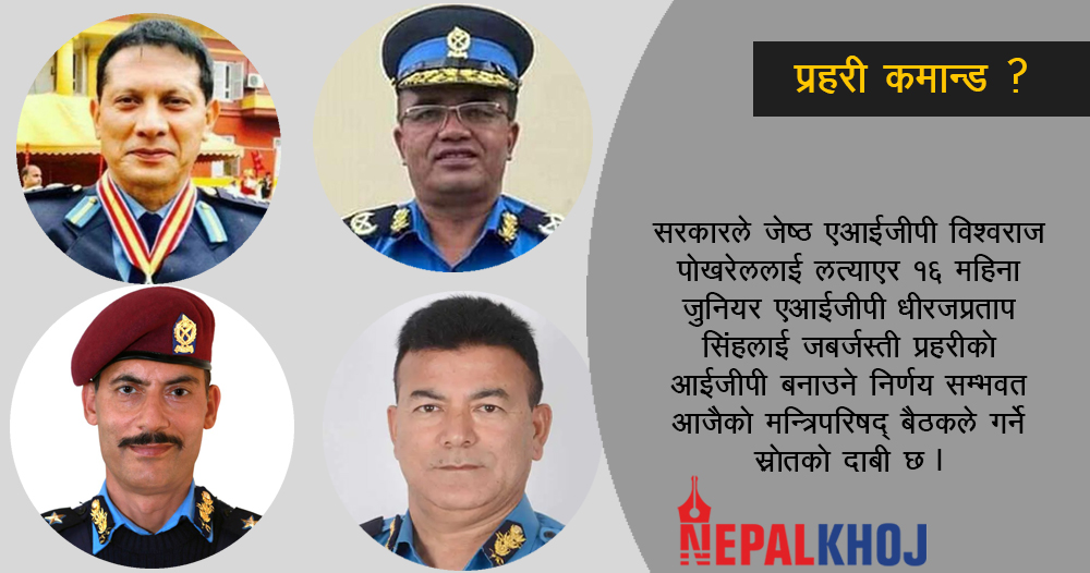 अहिलेका प्रहरी प्रमुख आईजीपी शैलेश थापा क्षेत्री भोलिबाट नियमित अवकाशमा जाँदैछन् । उनको स्थान कसले लिने हो भनेर सर्वत्र चासो र चिन्ताको विषय बनेको छ । प्रहरी कमान्ड सम्हाल्न धीरजप्रताप सिंहलाई सरकारले अघि सार्ने बताइएको छ । तर सिनियरका हिसाबले भने एआईजी विश्वराज पोखरेलले कमान्डको नेतृत्व गर्न पाउनु पर्ने हो । तर बिगतलाई कोट्याउने हो भने सरकारले आफूले चाहेको प्रहरीलाई कमान्ड सम्हालन दिने चलन छ ।