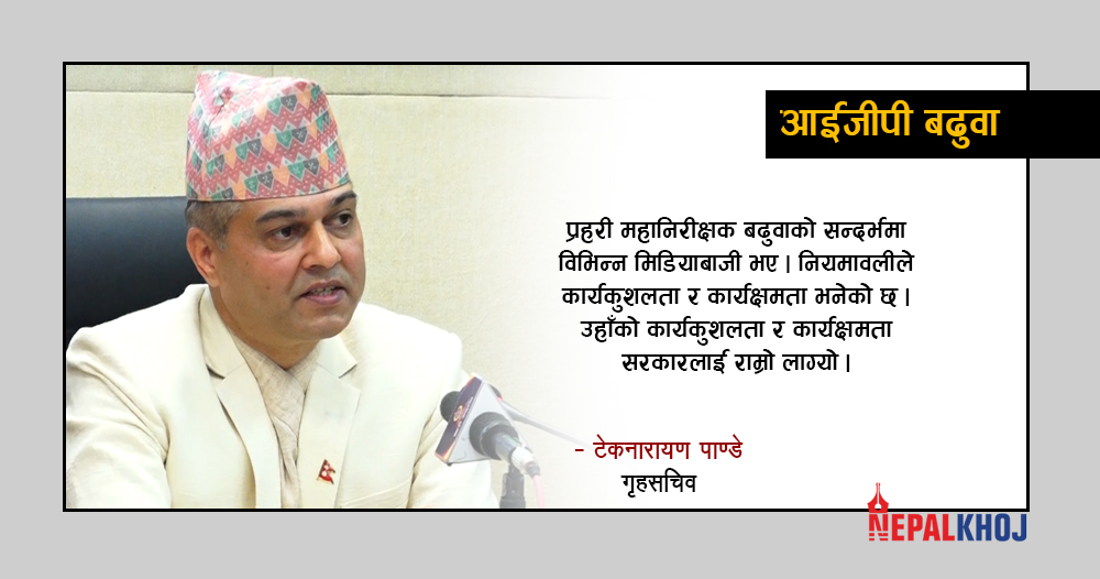 सचिव पाण्डेले भने, ‘प्रहरी महानिरीक्षक बढुवाको सन्दर्भमा विभिन्न मिडियाबाजी भए । हाम्रो प्रचलित कानुन प्रहरी नियमावलीमा भएको व्यवस्थाले ज्येष्ठता भन्छ । ज्येष्ठता भनेपछि सबै २०४९ साल चैत्र १२ गतेको नियुक्तिको मान्छेहरु नै अहिले महानिरीक्षक हुन उपयुक्त हो । सबै त्यही हुनुहुन्छ ४ जना नै । नियमावलीले कार्यकुशलता र कार्यक्षमता भनेको छ । सरकारलाई भएका एआईजीहरुमा नवनियुक्त महानिरीक्षकज्यू एआईजीबाट बढुवा हुनुभयो । उहाँको कार्य कुशलता र कार्य क्षमता सरकारलाई राम्रो लाग्यो ।’