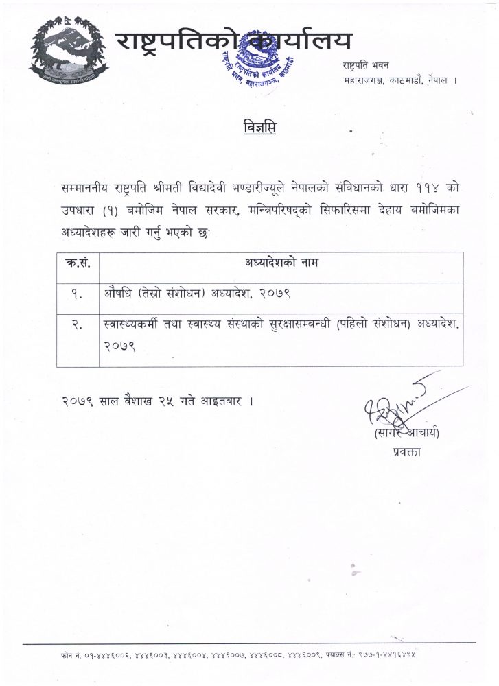 सरकारको सिफारिसमा औषधि (तेस्रो संशोधन) अध्यादेश, २०७९ र स्वास्थ्यकर्मी तथा स्वास्थ्य संस्थाको सुरक्षासम्बन्धी (पहिलो संशोधन) अध्यादेश, २०७९ जारी गरिएको शीतल निवासले जनाएको छ ।