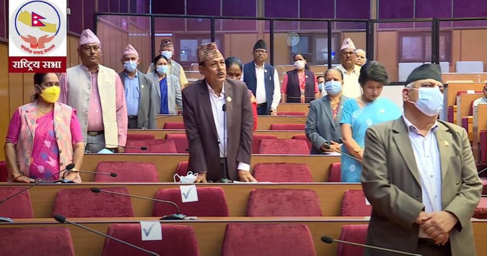 राष्ट्रियसभाका अध्यक्ष गणेशप्रसाद तिमिल्सिनाको पटकपटकको आग्रहपछि पनि एमालेका सांसदहरुले उभिएर विरोध नै जनाइरहेपछि उनले कार्यसूचीलाई अघि बढाए । राष्ट्रियसभाको आजको बैठकको लोकतन्त्र र गणतन्त्र प्राप्तिका निम्ति ज्यान उत्सर्ग गर्ने ज्ञान अज्ञात सहिदहरुप्रति एक मिनेट मौनधारण गरिएको थियो । बैठकको सुरुमा राष्ट्रपति विद्यादेवी भण्डारीबाट प्राप्त पत्रको व्यहोरा जानकारी गराएका थिए ।-रासस