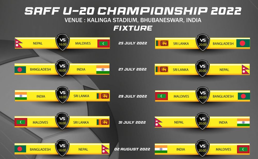 काठमाडाैं । साफ यू-२० पुरुष च्याम्पियनसिपको पहिलो खेलमा नेपालले माल्दिभ्ससँग खेल्ने भएको छ । दक्षिण एसिया फुटबल फेडेरेसनले सार्वजनिक गरेको खेल तालिका अनुसार नेपालको पहिलो भेट माल्दिभ्ससँग हुने भएको हो । जसमा नेपालले भुवनेश्वरस्थित कालिङ्गा स्टेडियममा नेपालको पहिलो खेल जुलाई २५ मा हुनेछ ।