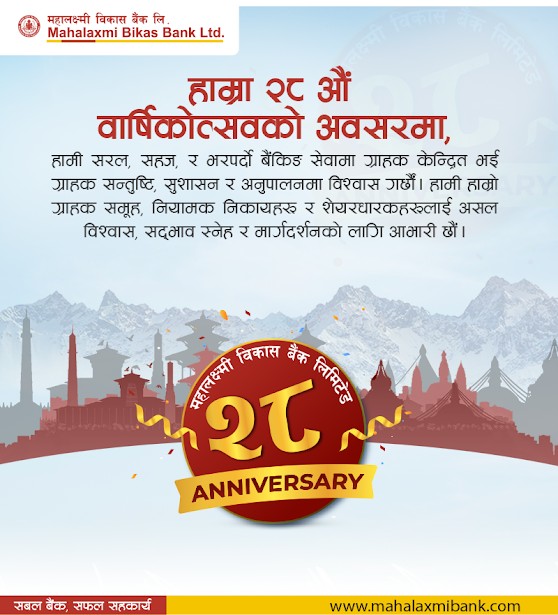 काठमाडौं । देशका सहरी तथा ग्रामीण क्षेत्रका विभिन्न स्थानहरूबाट बैकिङ सेवा प्रदान गर्दै आइरहेको यस महालक्ष्मी विकास बैंक जेठ ७ गतेदेखि २८औं वर्षमा प्रवेश गरेको छ । जेठ महिनालाई वार्षिकोत्सव महिनाका रुपमा मनाउन लागेको बैंकले देशैभरी छरिएर रहेका एक सय तीनवटा शाखाबाट करिब ६ लाख ग्राहकहरूलाई उच्चस्तरिय वित्तिय सेवाहरू सरलीकृत तवरले प्रदान गर्दै आइरहेको छ ।
