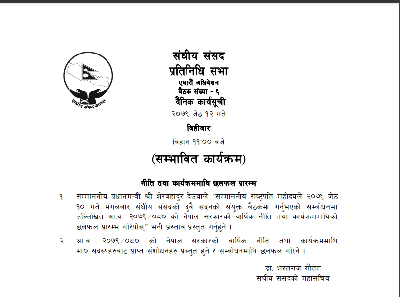 संघीय संसद सचिवालयका अनुसार आजको बैठकमा प्रधानमन्त्री शेरबहादुर देउवाले आगामी आर्थिक वर्ष २०७९/०८०को नीति तथा कार्यक्रम संसदमा छलफल प्रारम्भ गर्न प्रस्ताव पेस गर्ने कार्यसूची रहेको छ साथै सरकारको नीति तथा कार्यक्रममाथि सांसदहरूले संशोधन प्रस्तुत गर्ने र उक्त संशोधनमाथि छलफल सुरु हुने सचिवालयले जनाएको छ ।