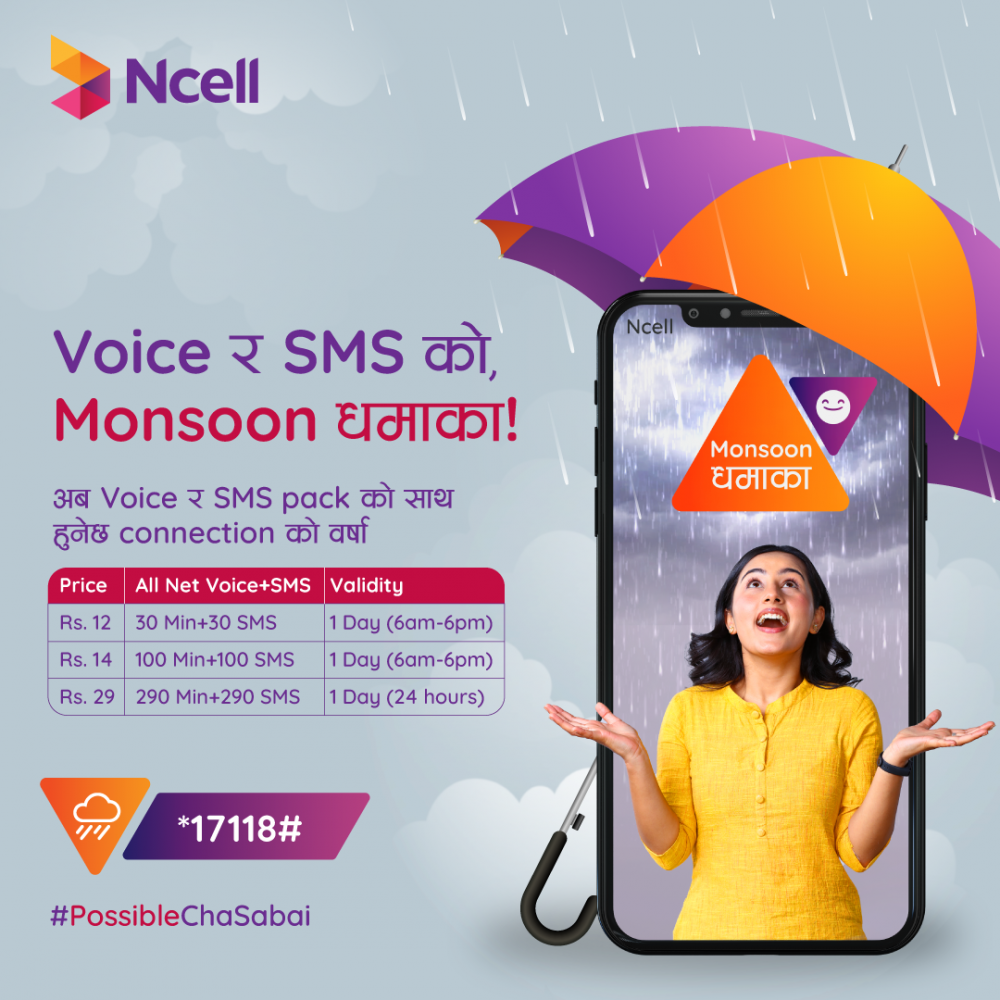 यस मनसुन धमाका अफर अन्तर्गतका डेटा प्याकहरु र अल नेट भ्वाइस र एसएमएस बन्डल प्याकहरु ग्राहकले एनसेल एप, एनसेलको वेबसाइट र डिजिटल वालेटहरु जस्तै ईसेवा, खल्ती र आइएमई पेबाट पनि सुचारु गर्न सक्नेछन् ।