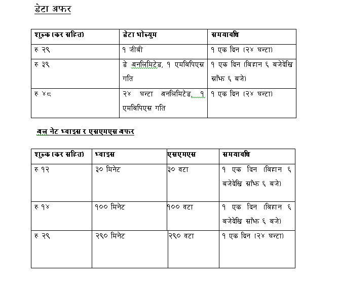 यी प्याकहरु बिहिबार (जेठ १९) बाट संचालनमा रहनेछन् । ग्राहकका दैनिक डेटाको आवश्यकताको सहज रुपमा सम्बोधन गर्न यस अफर अन्तर्गत एक दिन समयावधि भएका तीन डेटा प्याकहरु रहेका छन् । आफ्नो आवश्यकता अनुसार ग्राहकले कर सहित रु २९ देखि रु ४८ पर्ने आकर्षक डेटा प्याक सुचारु गर्न सक्नेछन् । एष्ट्रिक्स१७१२३ह्यास डायल गरि ग्राहकले यो प्याक खरिद गर्न सक्नेछन् ।