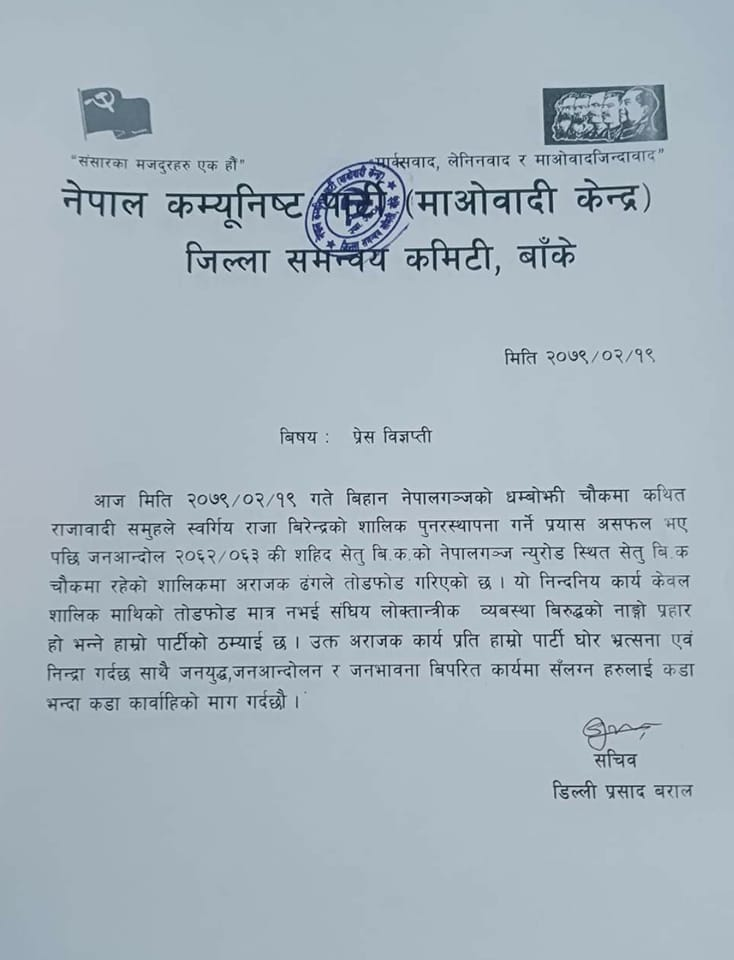 नेपालगञ्जको धम्बोझी चोकमा पूर्वराजा वीरेन्द्र शाहको राखेको सालिक प्रहरीले हटाएपछि विवाद सुरू भएकाे थियाे । राखेको सालिक प्रहरीले हटाएपछि उक्त समूहले न्युरोडमा रहेको सहिद सेतु बिकको सालिक तोडफोड गरेको हाे ।