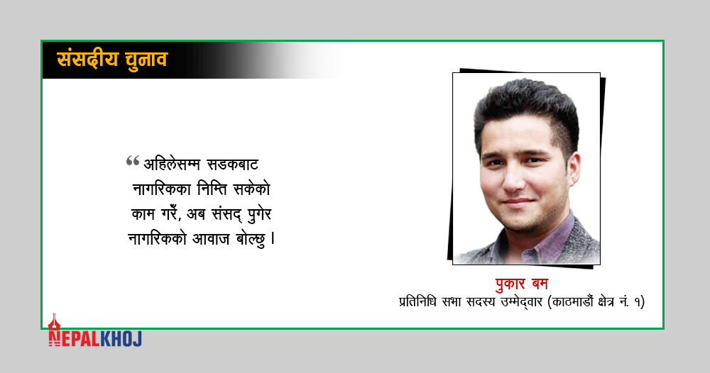 काठमाडौं । समाजिक तथा राजनीतिक अभियन्ता पुकार बमले काठमाडौं क्षेत्र नं १ बाट प्रतिनिधिसभा सदस्यका लागि उम्मेदवारी घोषणा गरेका छन् । बम स्वर्गीय उज्ज्वल थापासँगै तत्कालिन विवेकशील नेपाली दलका एक जना संस्थापक हुन् ।