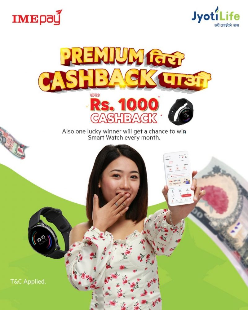 ‘प्रिमियम तिरौं क्यासब्याक पाऔ’ नामक अफरमार्फत प्रयोगकर्ताहरूले आईएमई पेमार्फत ज्योति लाइफ इन्स्योरन्सको प्रिमियम तोकिएको मिति मात्र नभई प्रिमियम तोकिएको मिति सकिएको ७ दिनभित्र भुक्तानी गर्दा एक हजार रुपैयाँसम्मको क्यासब्याक पाउनेछन् र अफर अवधिभर हरेक महिना एक भाग्यशाली विजेताले स्मार्ट घडी जित्न सक्नेछन् ।