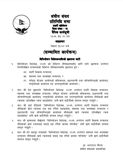 आजको बैठकमा सहरी विकास, स्वास्थ्य तथा जनसंख्या, राष्ट्रिय योजना आयोग, प्रधानमन्त्री तथा मन्त्रिपरिषद्को कार्यालय, राष्ट्रपति र उपराष्ट्रपतिको कार्यालयको विनियोजन शीर्षकमाथिको छलफल हुनेछ ।