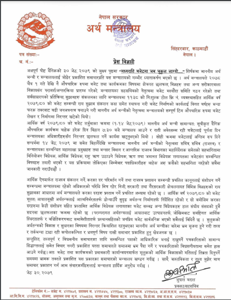 अर्थमन्त्रालयले भन्याे- बजेट निर्माणमा तोकिएका व्यक्तिबाहेक कोही पनि संलग्न छैनन्