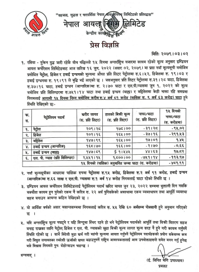 भारतले पठाएको नयाँ मूल्य सूचीअनुसार पेट्रोलमा प्रतिलिटर ३१ रुपैयाँ २८ पैसा घाटा रहेको निगमले दाबी गरेको छ । अहिले पेट्रोल प्रतिलिटर एक सय ७८ रुपैयाँमा बिक्री गर्दै आएकोमा अब लागत मूल्य दुई सय नाै रुपैयाँ २८ पैसा पुगेको निगमले विज्ञप्तिमा जनाएकाे छ । यस्तै डिजलमा अब प्रतिलिटर ३७ रुपैयाँ १६ पैसा र एलपी ग्यासमा प्रतिसिलिन्डर सात सय ५१ रुपैयाँ १४ पैसा घाटा हुने निगमले जनाएको छ ।