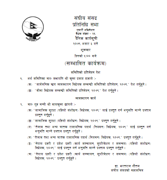 बैठकमा गृहमन्त्री बालकृष्ण खाँणले सामाजिक सुरक्षा (पहिलो संशोधन) विधेयक, २०७९ प्रस्तुत गर्नेछन् । सामाजिक सुरक्षा (पहिलो संशोधन) विधेयक, २०७९, तेजाब तथा अन्य घातक रासायनिक पदार्थ (नियमन) विधेयक, २०७९ प्रस्तुत गर्ने कार्यसूची रहेकाे संसद सचिवालयले जनाएको छ ।
