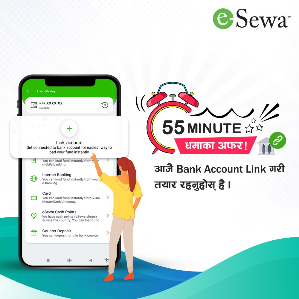 ई-सेवाको ‘५५ मिनेटको धमाका अफर’, बैंक एकाउन्ट लिंक गरे ५५ रुपैयाँ क्यास ब्याक