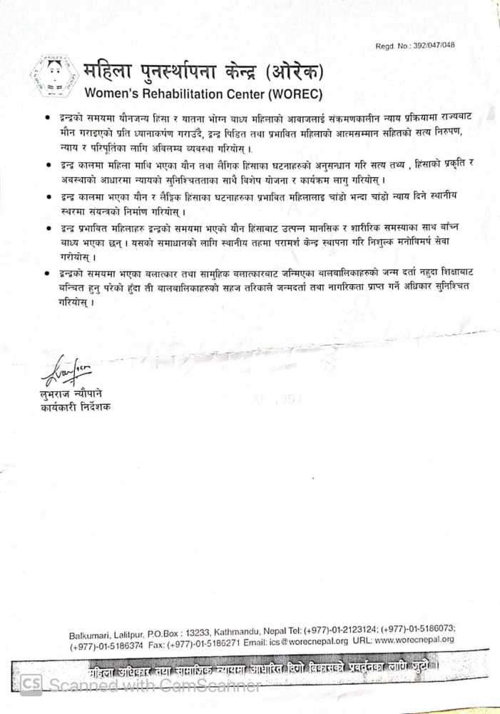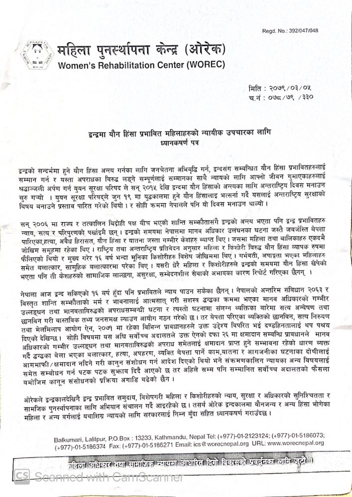 काठमाडाैं । द्वन्द्वका समयमा यौन हिंसा प्रभावित महिलाहरुको न्यायीक उपचारका लागि महिला पूर्नस्थापना केन्द् (ओरेक)ले माग गरेकाे छ ।
