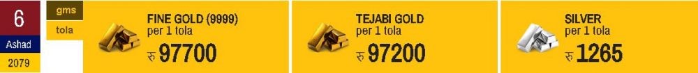 काठमाडौं । नेपाली बजारमा आज (साेमबार) सुन भाउ बढेकाे छ, भने चाँदीकाे स्थिर रहेकाे छ । छापावाल सुन आज प्रतितोला २ सयले बढेर ९७ हजार ७ सय रुपैयाँमा कारोबार भइरहेको नेपाल सुनचाँदी व्यवसायी महासंघले जनाएको छ । छापावाल सुन आइतबार पनि ९७ हजार ५ सय रुपैयाँमा कारोबार भएको थियो ।