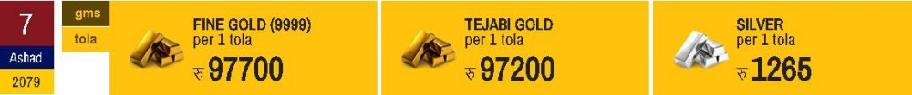 त्यस्तै महासंघका अनुसार तेजाबी सुनको मूल्य पनि स्थिर रहेको छ ।आज तेजाबी सुन ९७ हजार २ सय रुपैयाँमा कारोबार भइरहेको छ । सोमबार तेजाबी सुन ९७ हजार २ सय रुपैयाँमा कारोबार भएको थियो ।
