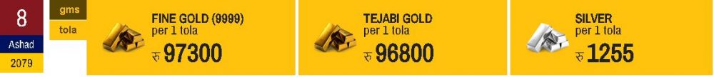 त्यसैगरी, चाँदीको मूल्य १० रुपैयाले घटेकाे छ । आज चाँदी १२ सय ५५ रुपैयाँमा कारोबार भइरहेको महासंघले जनाएको छ । मंगलबार चाँदी १२ सय ६५ रुपैयाँमा कारोबार भएको थियो ।