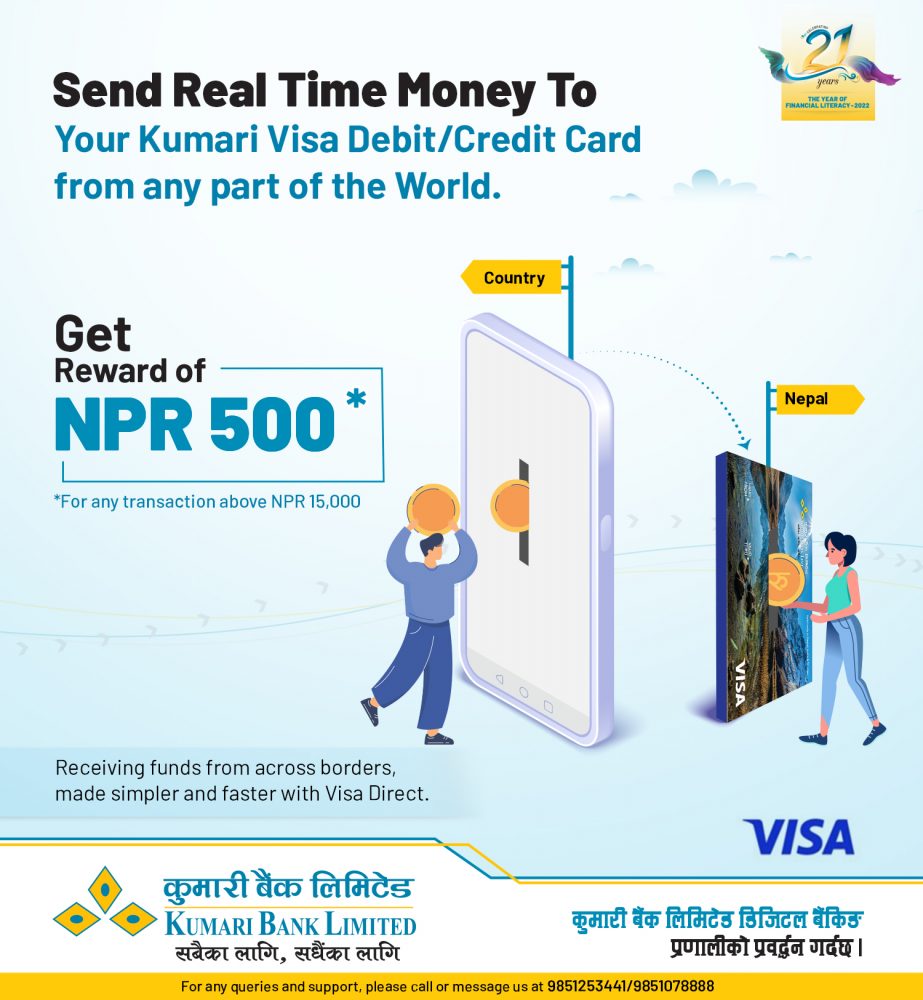 विदेशमा रहेका स्वदेशी तथा विदेशीले आफ्नो मोबाइल/इन्टरनेट बैंकिङ वा भिसा कार्ड तथा रेमिट्यान्स कम्पनीहरूमार्फत कुमारी बैंकको डेबिट/क्रेडिट एवं प्रिपेड भिसा कार्डमा रकम सहजै पठाउन सक्नेछन् ।