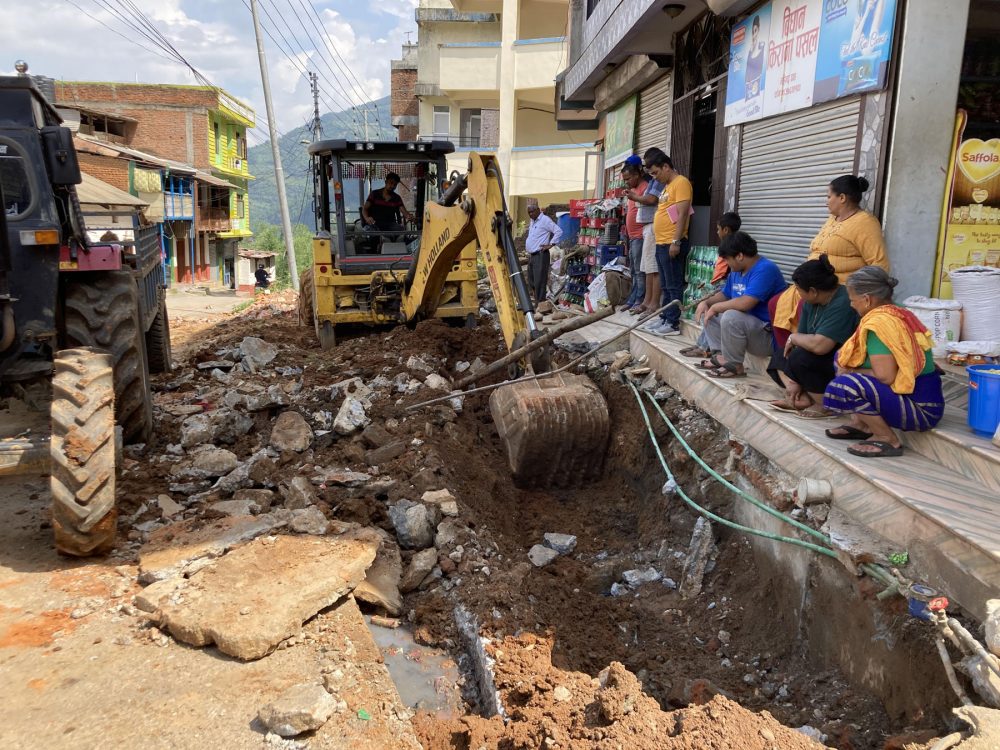 बागलुङ नगरपालिका २, मरेपिपलमा सडक-नाली विस्तार गरिँदै । यहाँ साँघुरो नाली हुँदा समस्या भएपछि बागलुङ नगरपालिकाले विस्तार गर्न थालेको हो । तस्बिर : खेमराज गौतम/रासस