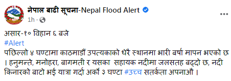 विभागका अनुसार हनुमन्ते, मनोहरा, वाग्मती र यसका  सहायक नदीमा जलसतह बढिरहेको छ । त्यसैले यी नदी किनारको बाटोबाट यात्रा गर्दा उच्च सतर्कता अपनाउन विभागले आग्रह गरेकाे छ ।