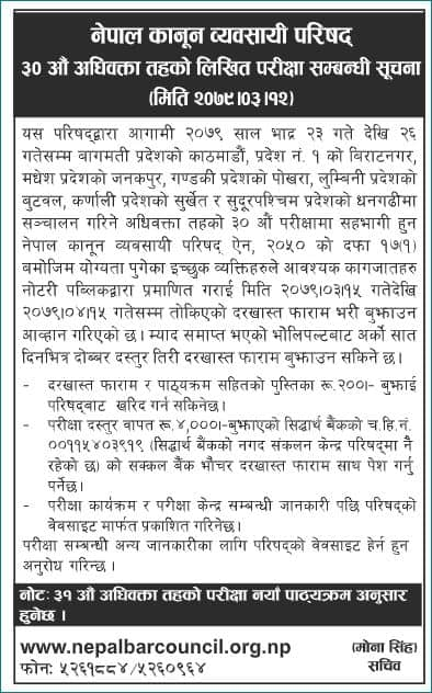 अधिवक्ता तहको ३०औं परीक्षामा सहभागी हुन नेपाल कानुन व्यवसायी परिषद् ऐन, २०५० को दफा १७१ बमोजिम योग्यता पुगेका इच्छुक व्यक्तिहरुले आवश्यक कागजातहरु नोटरी पब्लिकद्वारा प्रमाणित गराई मिति २०७९/०३/१५ गतेदेखि २०७९/०४/१५ गतेसम्म तोकिएको दरखास्त फाराम भरी बुझाउनुपर्ने छ ।