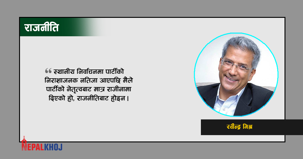 काठमाडौं । विवेकशील साझा पार्टीका पूर्वअध्यक्ष रवीन्द्र मिश्रले आफू राजनीतिबाट बाहिर नरहेको बताएका छन् ।