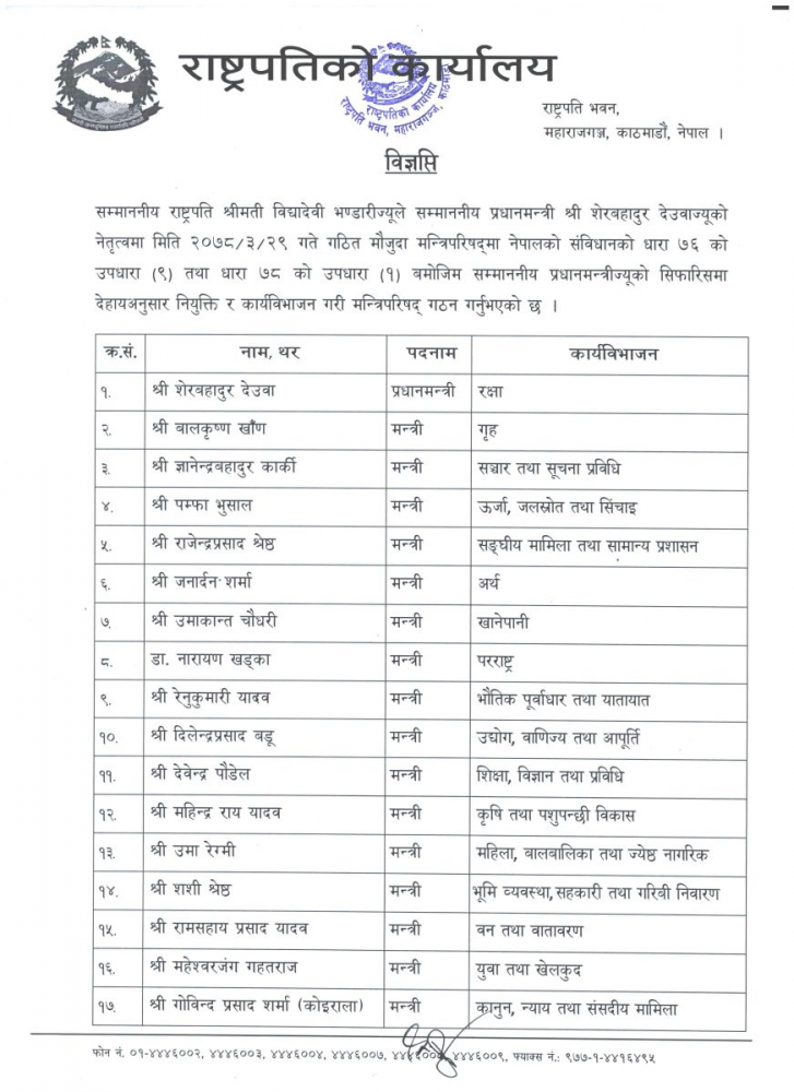 प्रधानमन्त्री देउवाले गरे मन्त्रिपरिषद् पुनर्गठन (नामसहित)