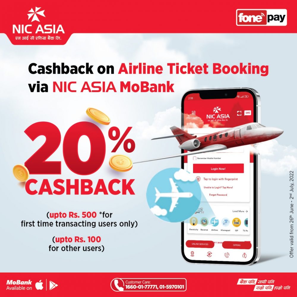 एनआईसी एशियाको मोबाइल बैंकिङ एपमार्फत एयरलाइन्स टिकटमा २० प्रतिशत ‘क्यास ब्याक’