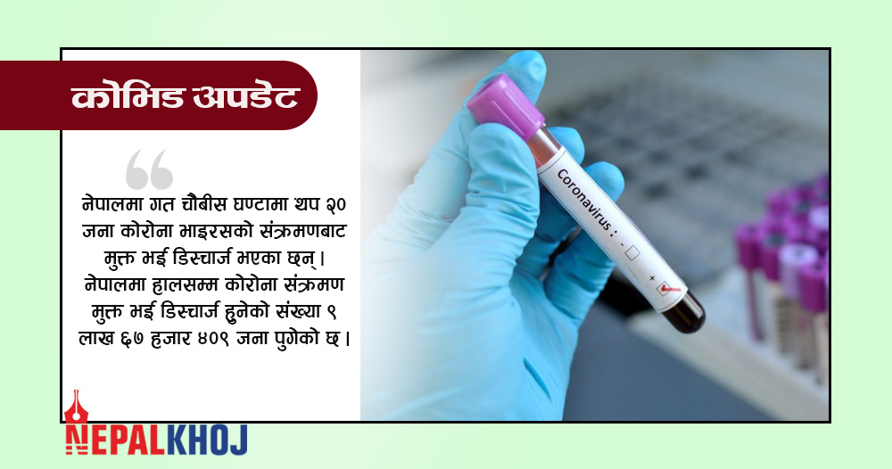 त्यस्तै, गत चौबीस घण्टामा थप २० जना कोरोना भाइरस संक्रमण मुक्त भई डिस्चार्ज भएका छन् । हिजो (आइतबार) भने १७ जना कोरोना संक्रमणबाट मुक्त भएका थिए । योसँगै आजसम्ममा नेपालमा कोरोना संक्रमण मुक्त भई डिस्चार्ज हुनेको संख्या ९ लाख ६७ हजार ४०९ जना पुगेको मन्त्रालयले जनाएको छ ।