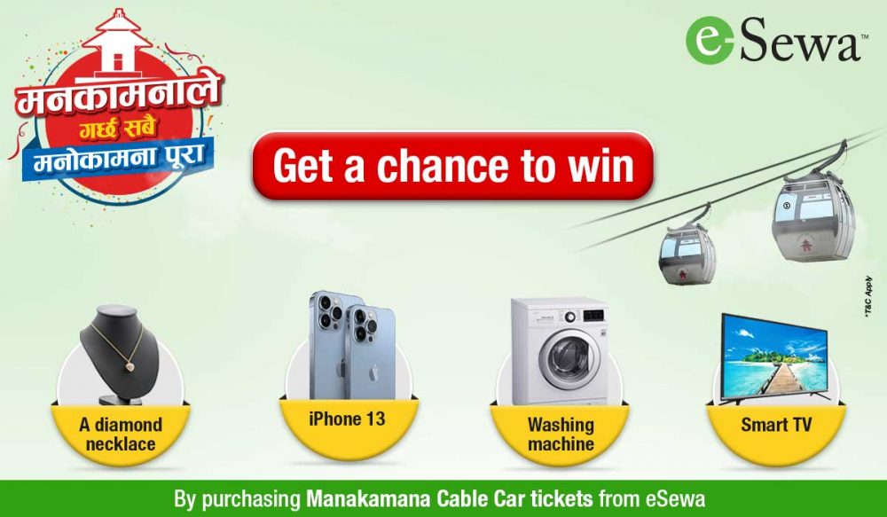 काठमाडौं । नेपालको पहिलो र अग्रणी भुक्तानी सेवा प्रदायक ई-सेवाले मनकामना केबलकारको टिकट काट्दा हीराको हारलगायत थुप्रै पुरस्कार जित्न सकिने योजना सञ्चालन गरेको छ ।