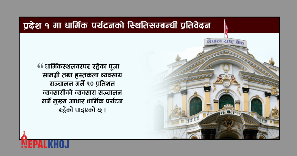 प्रदेश १ मा पहिचान भएका धार्मिकस्थलमध्ये छनोटमा परेका चार वटामा हुने धार्मिक पर्यटकीय गतिविधिमा संलग्न धार्मिक पर्यटक, पर्यटकस्तरीय होटेलका सञ्चालक, स्थानीय पूजा सामग्री, उपहार तथा हस्तकला व्यवसायी, यातायात व्यवसायी, स्थानीय व्यवसायी, उद्यमी, जनप्रतिनिधि, मन्दिर विकास/व्यवस्थापन समिति र प्रदेश १ मा रहेका धार्मिक पर्यटनसँग सम्बद्ध निकायहरूबाट व्यापार तथा व्यवसायको अवस्था, यातायात सेवाको उपलब्धता, धार्मिकस्थलमा भएका विकास तथा पूर्वाधार निर्माण, विकासका लागि गठन गरिएका विकास/व्यवस्थापन समितिहरूको भूमिका साथै, आन्तरिक तथा बाह्य पर्यटकको आवागमनसँग सम्बन्धित प्राथमिक तथा द्वितीय तथ्यांकसमेतलाई आधार बनाएर राष्ट्र बैंकले प्रतिवेदन सार्वजनिक गरेको हो ।