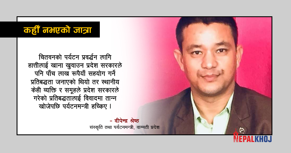 काठमाडौं । बागमती प्रदेशका संस्कृति तथा पर्यटनमन्त्री दीपेन्द्र श्रेष्ठले हात्ती वनभोजका लागि रकम भुक्तानी नगर्न निर्देशन दिएका छन् । चितवनको पर्यटकीय नगरी सौराहामा गत बिहीबार हात्तीलाई वनभोज खुवाइएको विषयमा निजी क्षेत्रका पर्यटन व्यवसायीले विरोध जनाएपछि उनले हात्ती वनभोजका लागि एक रुपैयाँ पनि भुक्तानी नदिने स्पष्ट पारे।