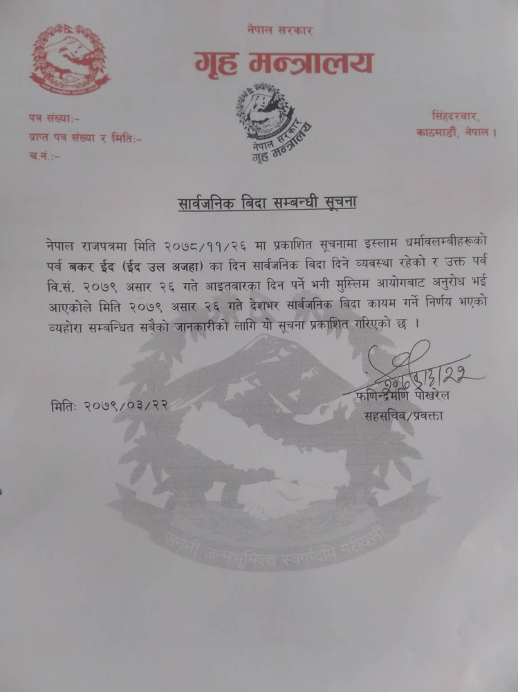 मन्त्रालयका प्रवक्ता तथा सहसचिव फणिन्द्रमणि पोखरेलद्वारा जारी विज्ञप्तिमा भनिएको छ, ‘नेपाल राजपत्रमा मिति २०७८/११/२६ मा प्रकाशित सूचनामा इस्लाम धर्मावलम्बीहरूको पर्व बकर इद (इद उल अजहा) का दिन सार्वजनिक बिदा दिने व्यवस्था रहेको र उक्त पर्व वि.सं. २०७९ असार २६ गते आइतबारका दिन पर्ने भनी मुस्लिम आयोगबाट अनुरोध भई आएकोले मिति २०७९ असार २६ गते देशभर सार्वजनिक बिदा कायम गर्ने निर्णय भएको व्यहोरा सम्बन्धित सबैको जानकारीको लागि यो सूचना प्रकाशित गरिएको छ ।’