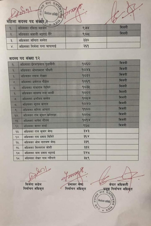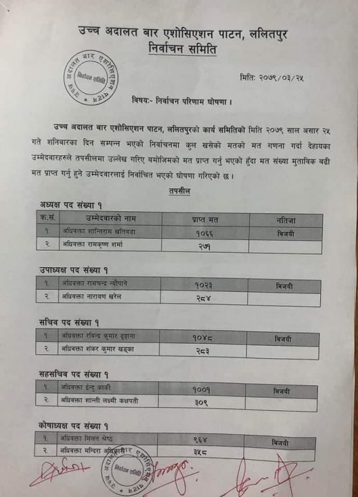 उच्च अदालत पाटन बारको निर्वाचन समितिका अनुसार महिला सदस्यको पदमा रमिता महर्जन र भवानी भट्टराई गैरे निर्वाचित भए । यस्तै अन्य १२ सदस्यमा ईश्वरप्रसाद पुडासैनी, ओमप्रकाश चौधरी, श्याम रोक्का, धर्मराज पौडेल, राजाराम घिमिरे, लावण्यराज कार्की, धनजित बस्नेत, सुलभ खनाल, सरिता आचार्य, रामकुमार खतिवडा, भावेश गौतम र सागर शर्मा विजयी भएको निर्वाचन समितिले जनाएको छ ।