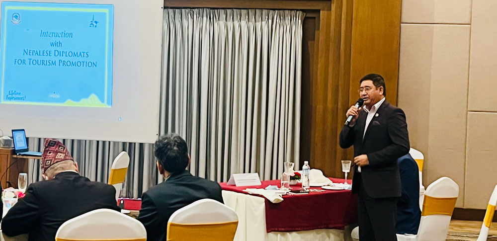 हालै नियुक्त तथा प्रस्तावित विभिन्न देशका राजदूतहरुसँग मन्त्रालयले सोमबार गरेको अन्तक्र्रियामा मन्त्री श्रेष्ठले नेपालमा विदेशी पर्यटकको आगमन बढाउन कूटनीतिज्ञहरूको भूमिका महत्त्वपूर्ण हुने बताए । विदेशस्थित सबै नियोग परिचालन गरेर नेपालमा विदेशी पर्यटकको आगमन बढाउन सकिने मन्त्री श्रेष्ठले बताएका हुन् ।