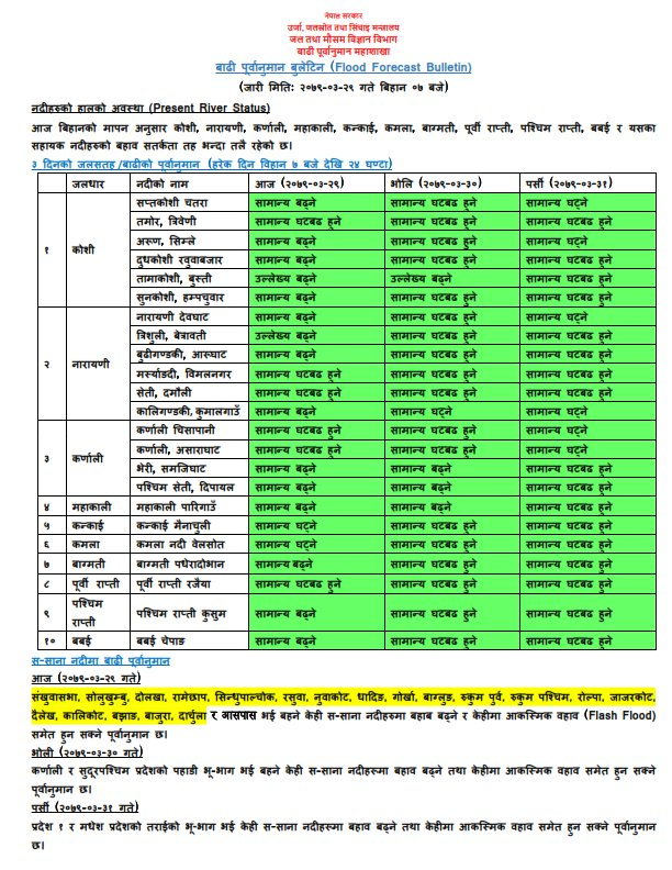 आज संखुवासभा, सोलुखुम्बु, दोलखा, रामेछाप, सिन्धुपाल्चोक, रसुवा, नुवाकोट, धादिङ, गोरखा, बागलुङ, रुकुम पूर्व, रुकुम पश्चिम, रोल्पा, जाजरकोट, दैलेख, कालीकोट, बझाङ, बाजुरा, दार्चुला र आसपास भई बहने केही साना नदीहरूमा बहाव बढ्नेछ ।