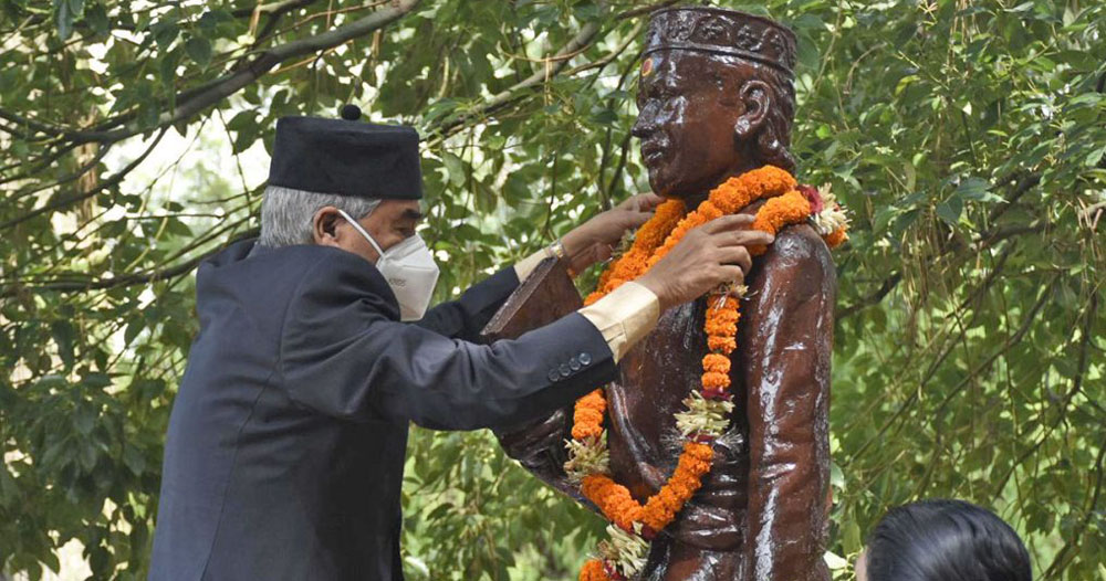 काठमाडौं । प्रधानमन्त्री शेरबहादुर देउवाले आदिकवि भानुभक्त आचार्यको २०९औँ जयन्तीका अवसरमा आज कमलादीस्थित नेपाल प्रज्ञा प्रतिष्ठानमा अवस्थित भानुको प्रतिमामा माल्यार्पण गरेका छन् ।
