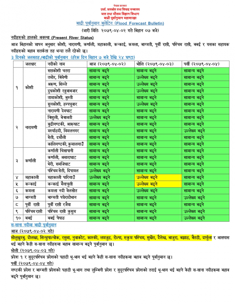 आज सोलुखुम्बु, दोलखा, सिन्धुपाल्चोक, रसुवा, नुवाकोट, कास्की, लमजुङ, रोल्पा, रुकुम पश्चिम, सुर्खेत, दैलेख, बाजुरा, बझाङ, बैतडी, दार्चुला र आसपास भई बहने केही साना नदीहरूमा बहाव बढ्नेछ ।