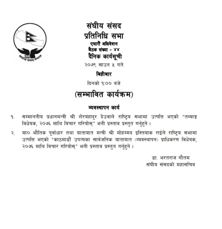 आजको बैठकमा प्रधानमन्त्री शेरबहादुर देउवाले राष्ट्रिय सभामा उत्पत्ति भएको तथ्यांक विधेयक, २०७६ संसदमा प्रस्तुत् गर्ने तथा भौतिक पूर्वाधार तथा यातायात मन्त्री मोहम्मद इस्तियाक राईले राष्ट्रिय सभामा उत्पत्ति भएको काठमाडौं उपत्यका सार्वजनिक यातायात व्यवस्थापन प्राधिकरण विधेयक, २०७६ संसद्मा पेस गर्ने सम्भावित कार्यसूची रहेको संसद् सचिवालयले जनाएको छ ।