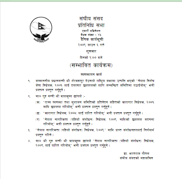 नेपाल विशेष सेवा विधेयक, २०७६’ छलफलका लागि सम्बन्धित समितिमा पठाउन प्रस्ताव गर्ने, राज्य व्यवस्था तथा सुशासन समितिको प्रतिवेदनसहितको कारागार विधेयक, २०७६ छलफलका लागि सदनमा प्रस्तुत गर्ने कार्यसूची रहेको छ ।