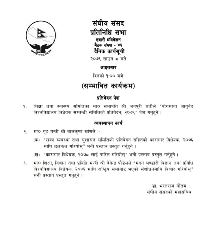साथै, मदन भण्डारी विज्ञान तथा प्रविधि विश्वविद्यालय विधेयकमाथि राष्ट्रिय सभावाट भएको संशोधन प्रस्ताव पनि आजको बैठकमा पेस हुने कार्यसूची रहेको संसद् सचिवालयले उल्लेख गरेकाे छ ।