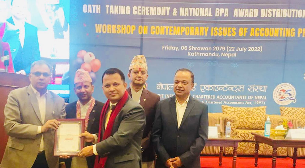 काठमाडौं । नेपाल चार्टर्ड एकाउन्टेन्ट्स संस्था (आईक्यान) ले हरेक वर्ष नेपाल वित्तीय प्रतिवेदन मान (एनएफआरएस) प्रणालीमार्फत वित्तीय विवरण प्रकाशन गर्ने उत्कृष्ट संस्थाहरुलाई प्रदान गर्दै आएको विभिन्न विधाहरुमध्ये वित्तीय क्षेत्रतर्फ आर्थिक वर्ष ०७७/७८ का लागि उत्कृष्ट वार्षिक प्रतिवेदन प्रस्तुत पुरस्कार मुक्तिनाथ विकास बैंकले प्राप्त गरेको छ । यो पुरस्कारबाट मुक्तिनाथ बैंक आर्थिक वर्ष ०७५/७६, ०७६/७७ र ०७७/७८ गरी लगातार तीनपटक पुरस्कृत भएको हो ।