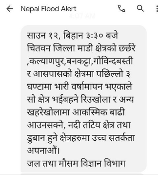साथै, चितवनकै शक्तिखोर, पर्साको ठोरी र आसपासका स्थानमा पनि भारी वर्षा भएको छ । र, थप वर्षा हुनसक्ने भएकाले सो क्षेत्र भएर बहने राप्तीलगायत अन्य साना नदीमा आकस्मिक बहाव हुनसक्ने र डुबान भइरहने होचा स्थान र तटीय क्षेत्रमा सतर्कता अपनाउन पनि महाशाखाले अनुराेध गरेकाे छ ।