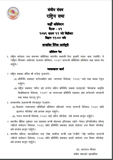 नेपाल इन्जिनियरिङ परिषद (पहिलो संशोधन) विधेयक, २०७६ माथि प्रतिनिधि सभाबाट भएको संशोधन, जेष्ठ नागरिक सम्बन्धी (पहिलो संशोधन) विधेयक, २०७५ माथि प्रतिनिधि सभाबाट भएको संशोधन उपर विचार गरियोस् भन्ने प्रस्ताव प्रस्तुत गर्नेलगायत कार्यसूची रहेको संसद सचिवालयले जनाएको छ ।