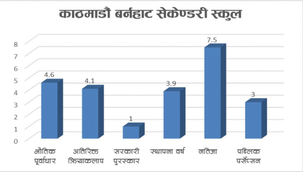 काठमाडौं बर्नहार्ट सेकेण्डरी स्कुलको अब्बल नतिजाको मुख्य कारण स्कुलिङ र ग्रुमिङ हो । २२ वर्षदेखि कक्षा ११ र १२ मा विज्ञान र व्यवस्थापन संकायमा अध्ययन अध्यापन गराउँदै आएको यस स्कुलले विद्यार्थीको पढाइका अतिरिक्त नेतृत्वकलालाई पनि उत्तिकै स्थान दिँदै आएको छ । शान्त वातावरण, अनुभवी शिक्षक–शिक्षिका, नैतिक शिक्षामा जोडजस्ता कुराले पनि विद्यालयको नतिजा उत्कृष्ट ल्याउनमा प्रमुख भूमिका खेलिरहेको प्रिन्सिपल नवराज अधिकारी बताउँछन् । ‘हामी विद्यार्थीलाई अनुशासनमा राख्न कडाई गर्ने होइन्, अनुशासन सिकाउँछौं,’ उनले भने, ‘साथै, विद्यार्थीको नेतृत्व विद्यार्थीलाई नै गर्न दिन्छौं ।’