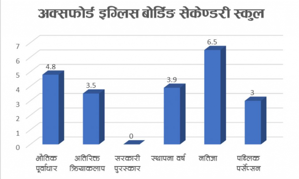रुपन्देहीको अक्सफोर्ड इङ्ग्लिस बोर्डिङ स्कुल पनि अब्बल माविमा पर्छ । यहाँको उत्कृष्ट नतिजाको कारण विद्यार्थी केन्द्रीत सिकाइ नै हो । यहाँका हरेक विद्यार्थीलाई आन्तरिक मुल्यांकनका आधारमा छात्रवृत्ति दिने गरेको कलेजका प्रिन्सिपल दिनेश भुसाल बताउँछन् । ‘हामी प्रत्येक महिना विद्यार्थीको आन्तरिक मुल्यांकन गर्छौं,’ उनले भने, ‘परीक्षाको नतिजाका आधारमा २५ देखि १०० प्रतिशतसम्म छात्रवृत्ति दिन्छौं । साथै, नगद पुरस्कार पनि दिन्छौं । जसले गर्दा विद्यार्थीमा प्रतिस्पर्धाको भावना विकास भएर पढ्न प्रेरित हुँदा रहेछन् ।’ यस कलेजको प्रत्येक आन्तरिक परीक्षामा ३.६५ भन्दा माथि जीपीए ल्याउने विद्यार्थीले १० हजार पुरस्कार र मासिक शुल्कमा छुट हुने भुसालले बताए । साथै, पारिवारिक वातावरण, प्रशस्त छात्रवृत्ति, अनुभवी शिक्षक शिक्षिका, सबल भौतिक पूर्वाधार, अत्याधुनिक ल्याब यहाँका थप आकर्षण हुन् । १९ वर्षदेखि कक्षा ११ र १२ लाई पढाउँदैं आएको यो माविले उत्कृष्ट माविको पुरस्कार भने पाएको छैन । यो पटक ब्रिटिस काउन्सिलले दिने इन्टरनेशल स्कुल एवार्ड भने यो माविले पाएको छ ।