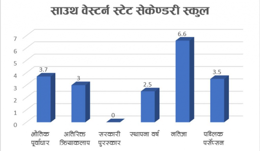 राजधानीका माविहरुको भीडमा उत्कृष्ट मावि हो– साउथ वेष्टर्न स्टेट सेकेण्डरी स्कुल । घोकन्तेभन्दा पनि व्यवहारिक शिक्षामा जोड दिँदै आएको माविले हरेक वर्ष विद्यार्थी भर्नामा विशेष होसियारी अपनाउँछ । मेहनती विद्यार्थीको मुल्यांकन गरेरमात्र भर्ना लिने भएकाले अहिलेसम्म राम्रो नतिजा ल्याउन सफल भएको माविका सहायक प्रिन्सिपल हरिसिंह केसी बताउँछन् । ‘हामी विद्यार्थीको पढाइमात्र होइन्, करियर काउन्सिलिङमा पनि विशेष ध्यान दिन्छौं,’ उनले भने, ‘विद्यार्थीलाई घोकन्तेभन्दा पनि व्यवहारिक शिक्षामा जोड दिँदै आएका छौं ।’ विगत १२ वर्षयता कक्षा ११ र १२ को अध्ययन अध्यापन गराउँदै आएको यस माविले विज्ञान, व्यवस्थापन, मानविकी र कानुन संकाय अध्यापन गराउँदै आएको छ । यसैगरी, यस विद्यालयले विद्यार्थीहरुलाई राष्ट्रिय तथा अन्तर्राष्ट्रियस्तरका तालिम तथा गोष्ठीहरुमा समेत समावेश गराउँदै आएको छ । साउथ वेस्टर्न स्टेट माविले अहिलेसम्म उत्कृष्ट माविको पुरस्कार भने नपाएको केसीले बताए ।
