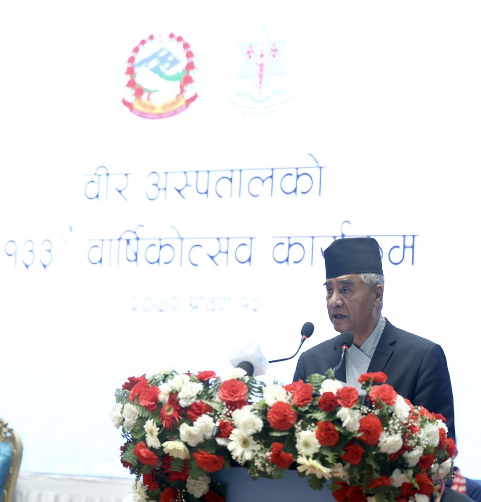 काठमाडौं । प्रधानमन्त्री शेरबहादुर देउवाले वीर अस्पतालले स्थापनाकालदेखि हालसम्म मुलुकमा स्वास्थ्योपचारको क्षेत्रमा पुर्याएको योगदान अतुलनीय रहेको बताएका छन् । वीर अस्पतालको १३३औँ वार्षिकोत्सवको अवसरमा आज यहाँ आयोजित समारोहलाई सम्बोधन गर्दै उनले आम सर्वसाधारणलाई गुणस्तरीय आधुनिक स्वास्थ्योपचार सेवा प्रदान गरी यस अस्पतालले आम जनताको विश्वास जित्न सकेको उल्लेख गरे ।