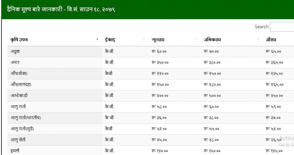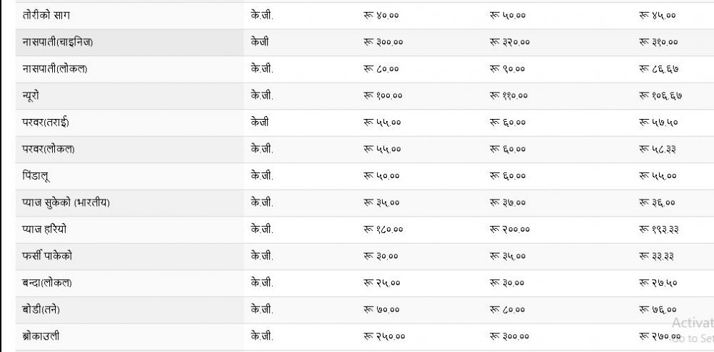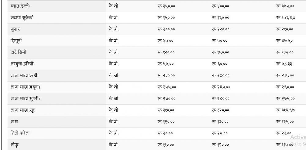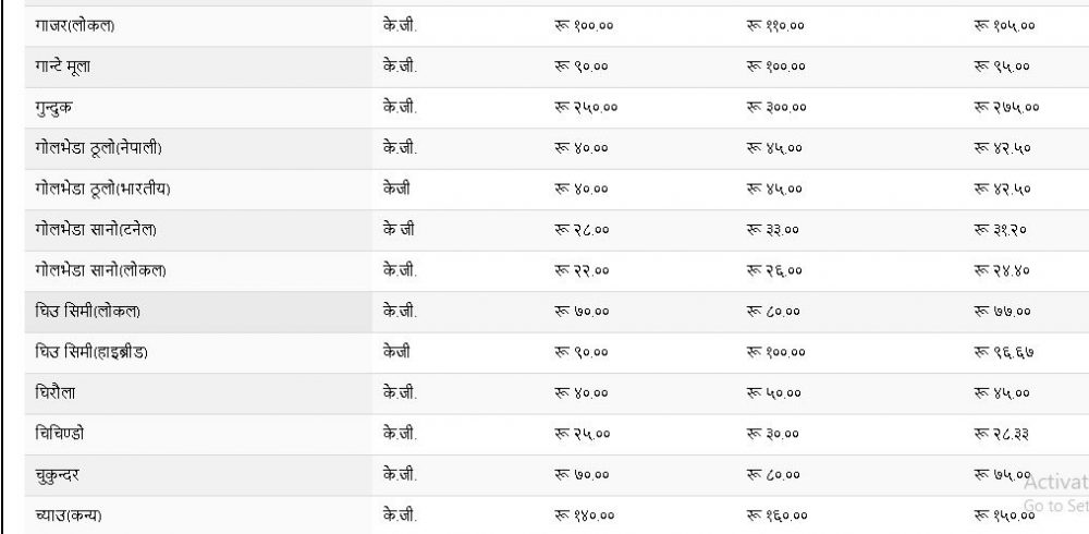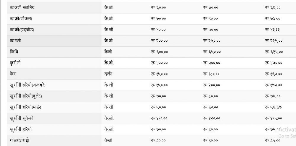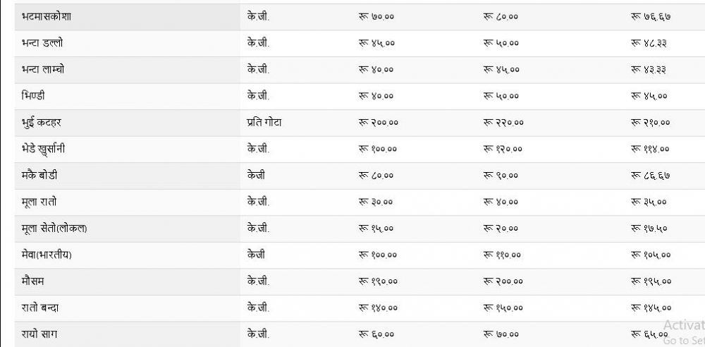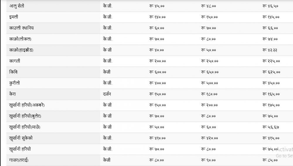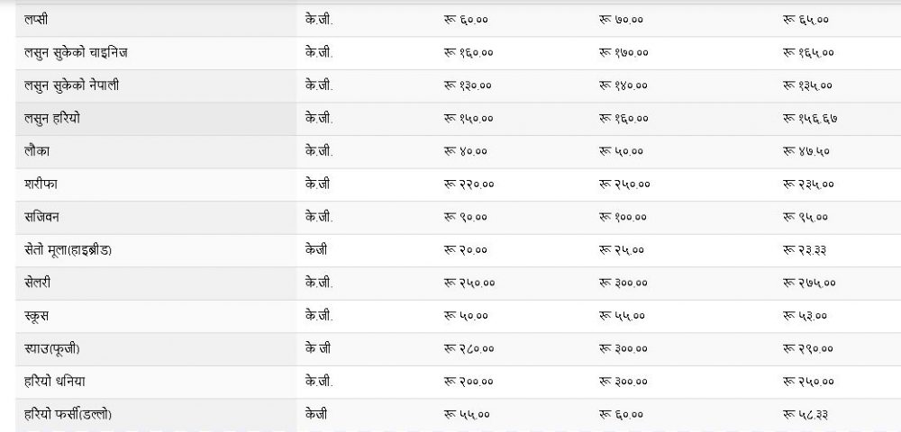 रातो आलुको औसत मूल्य प्रतिकेजी ५९ रुपैयाँ तोकिएको छ । मालदह आँप प्रतिकेजी २६५ रुपैयाँ र केरा दर्जनको १६५ रुपैयाँ तोकिएको छ । स्थानीय काउली ६६ रुपैयाँ, कागती २२५ रुपैयाँ, र लोकल सानो गोलभेँडा २४ रुपैयाँ ४० पैसाप्रति केजी तोकिएको छ । तेस्तै, हरियो खुर्सानी (बुलेट) प्रतिकेजी ७५ रुपैयाँ तोकिएको छ ।