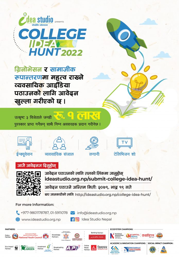 नेपाली समाजको रुपान्तरण र व्यवसायीकताको प्रवद्र्दनमा क्रियाशिल आइडिया स्टुडियोले उच्च शिक्षा अध्ययन गरीरहेका तथा नयाँ योजना र आईडियासहित शो उद्यम गर्ने सोच बनाएका विधार्थीहरुलाई लक्षित गरी कलेज आइडिया हन्ट २०२२ को आयोजना गरेको हो । वर्तमान यूग र समय सापेक्ष समस्या र अवसरहरु सम्बन्धित नविनतम तथा दिगो समाधान सहितका आइडिया भएका विधार्थीहरुले कलेज आईडिया हन्टमा आफ्नो योजना पठाउन सक्नेछन् ।